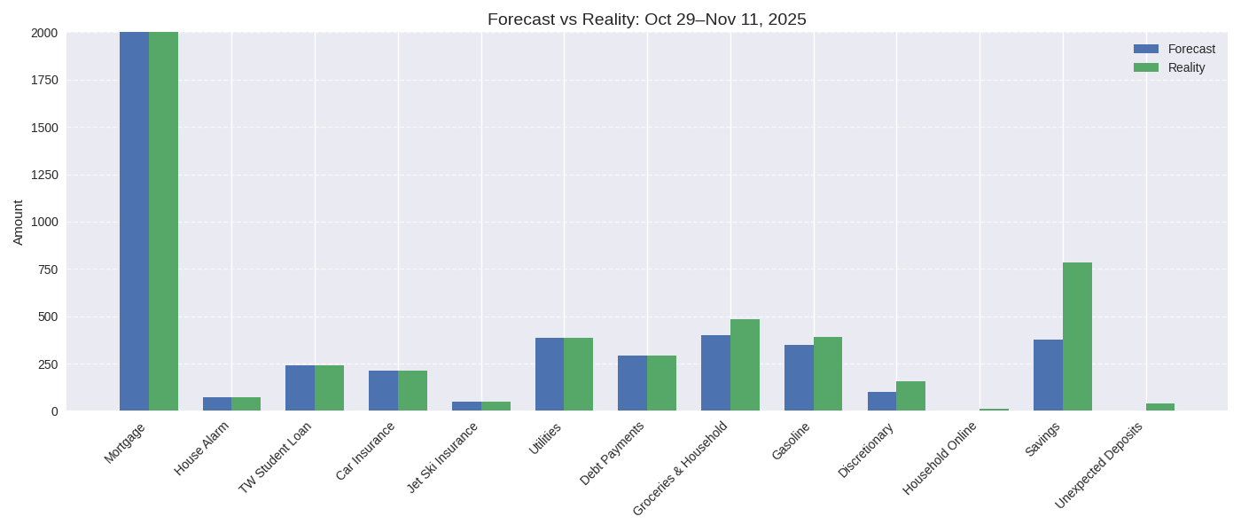 This full chart shows every category side by side — forecast vs. reality — across the first paycheck cycle. It’s the big-picture view of how Plan B held up under real-life conditions.
